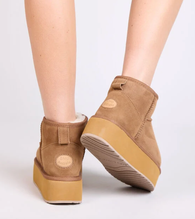 Introducing the Stinger Micro Flatform by EMU Australia — a contemporary twist on the classic Australian sheepskin boot. Crafted from water-resistant, double-face sheepskin, these boots effortlessly blend the latest street style with a fashionable 5cm Platform heel.